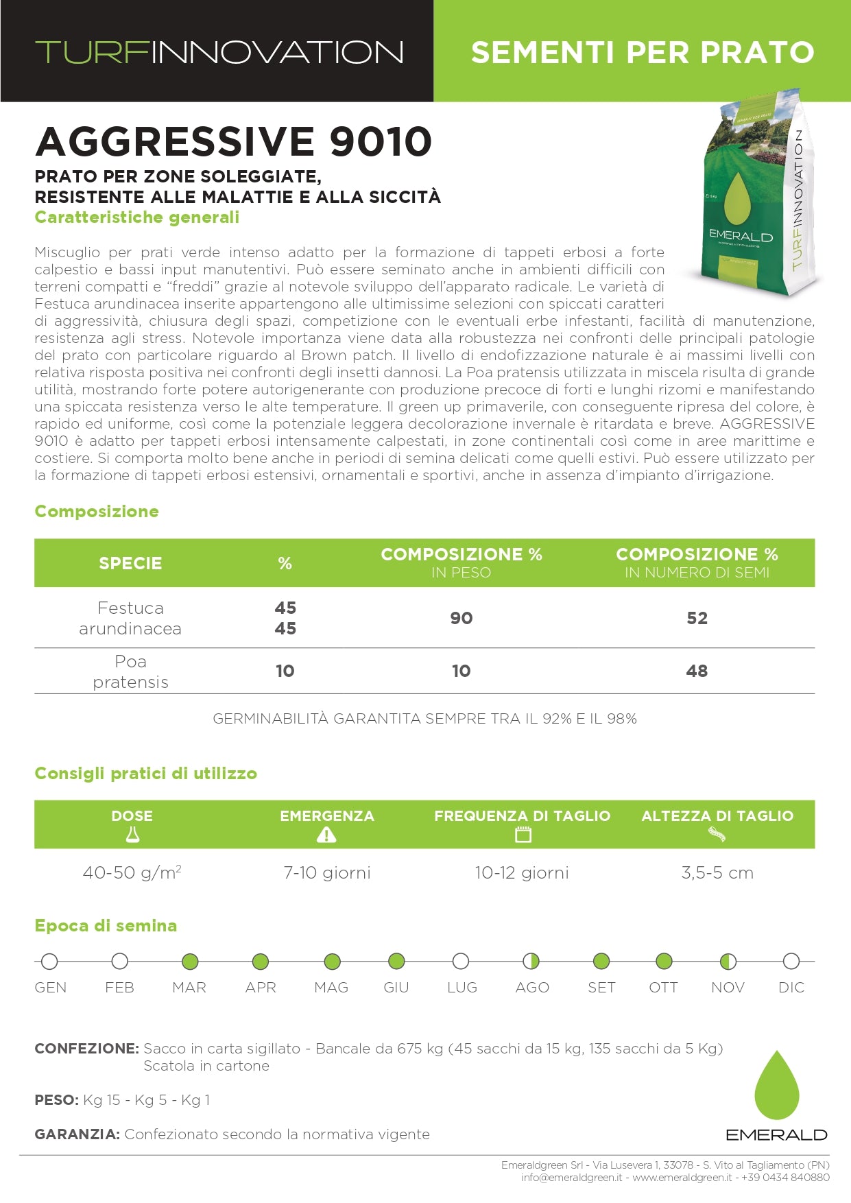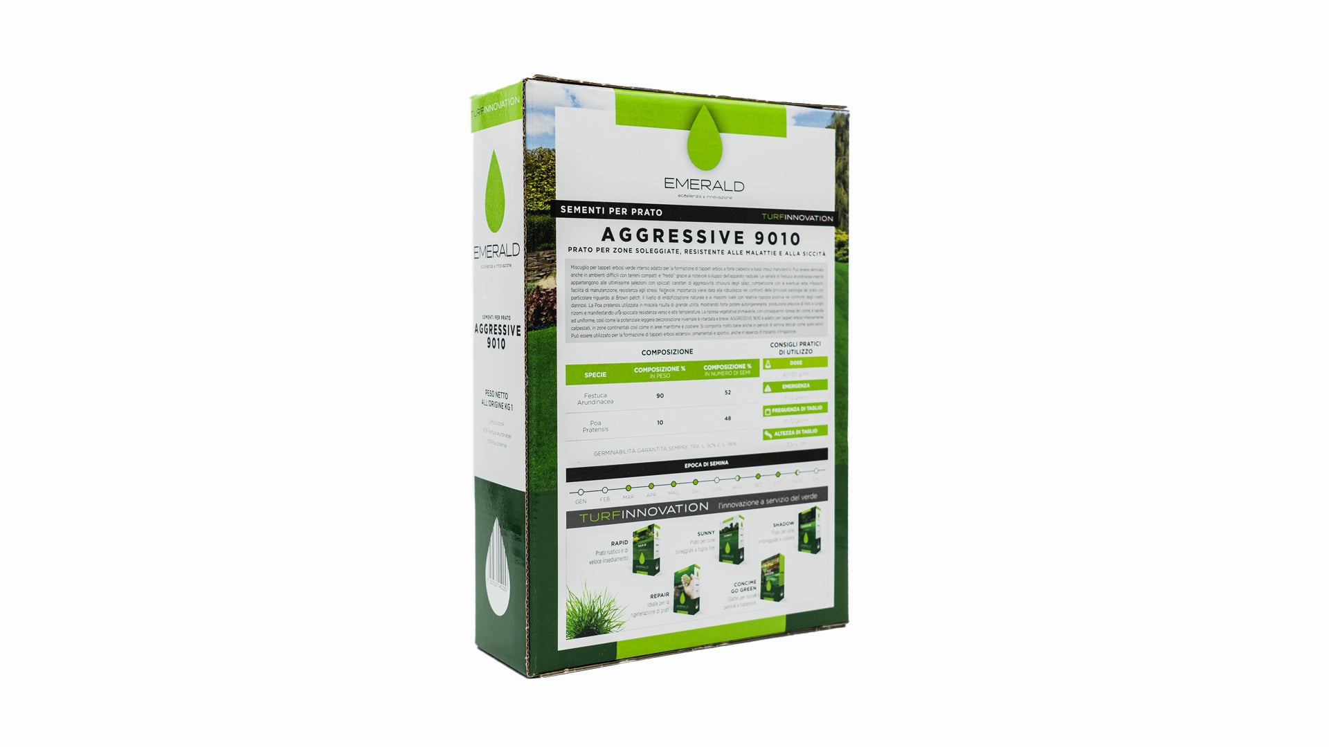 La green up primaverile, con conseguente ripresa del colore, è rapido ed uniforme, così come la potenziale leggera decolorazione invernale è ritardata e breve. AGGRESSIVE 9010 è adatto per tappeti erbosi intensamente calpestati, in zone continentali così come in aree marittime e costiere. Si comporta molto bene anche in periodi di semina delicati come quelli estivi. Può essere utilizzato per la formazione di tappeti erbosi estensivi, ornamentali e sportivi, anche in assenza d’impianto d’irrigazione.