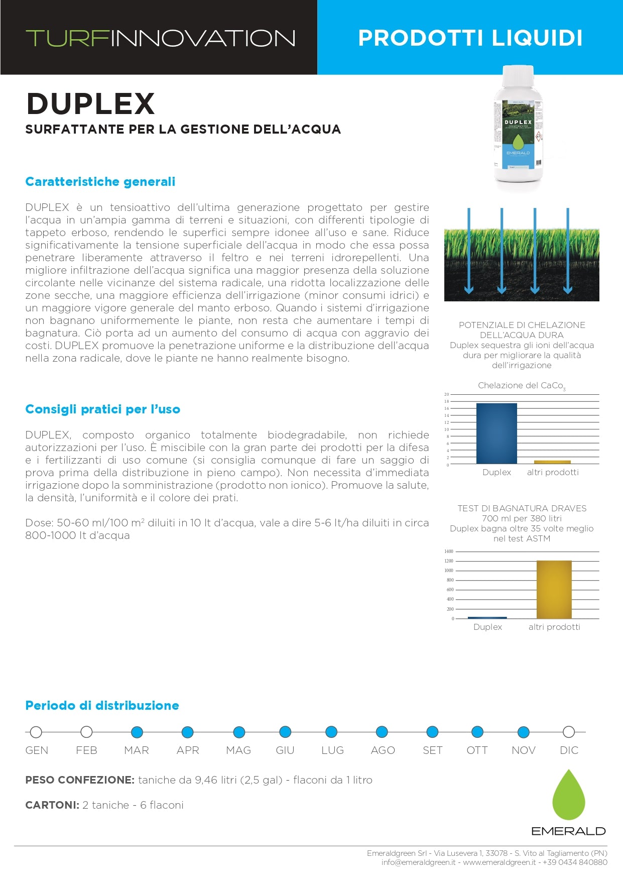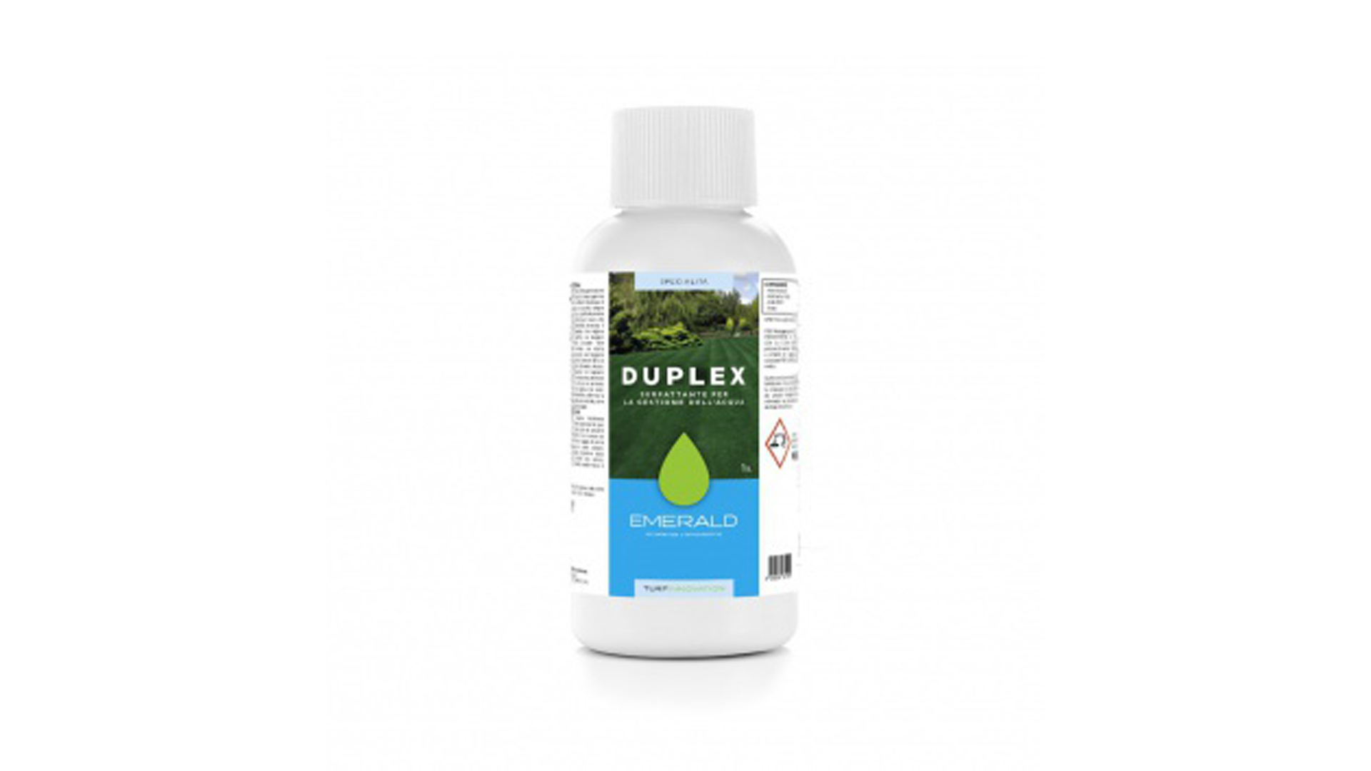 DUPLEX è un tensioattivo dell’ultima generazione progettato per gestire l’acqua in un’ampia gamma di terreni e situazioni, con differenti tipologie di tappeto erboso, rendendo le superfici sempre idonee all’uso e sane. Riduce significativamente la tensione superficiale dell’acqua in modo che essa possa penetrare liberamente attraverso il feltro e nei terreni idrorepellenti. Una migliore infiltrazione dell’acqua significa una maggior presenza della soluzione circolante nelle vicinanze del sistema radicale, una ridotta localizzazione delle zone secche, una maggiore efficienza dell’irrigazione (minor consumi idrici) e un maggiore vigore generale del manto erboso. Quando i sistemi d’irrigazione non bagnano uniformemente le piante, non resta che aumentare i tempi di bagnatura. Ciò porta ad un aumento del consumo di acqua con aggravio dei costi. DUPLEX promuove la penetrazione uniforme e la distribuzione dell’acqua nella zona radicale, dove le piante ne hanno realmente bisogno.