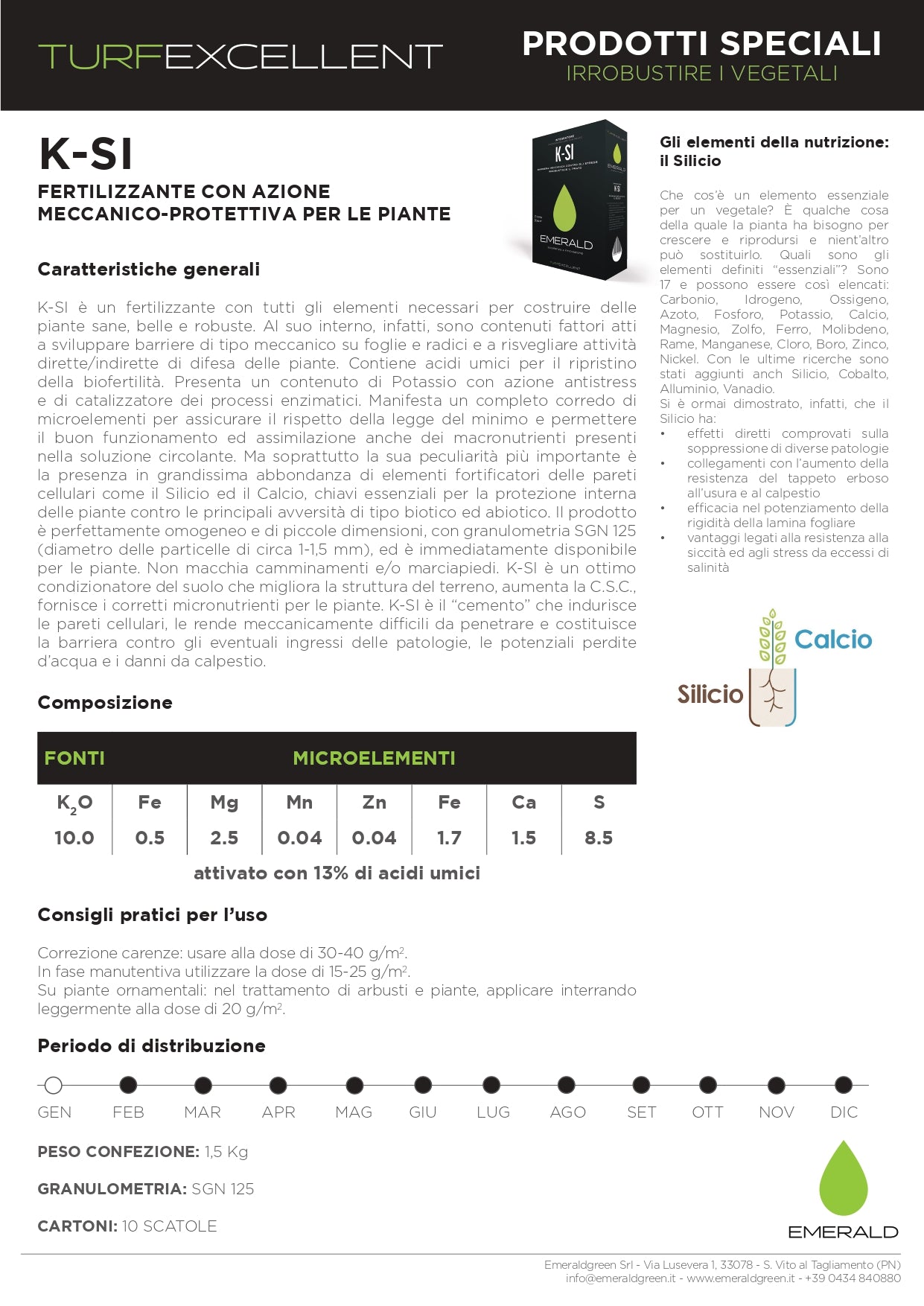 K-SI è un ottimo condizionatore del suolo che migliora la struttura del terreno, aumenta la C.S.C., fornisce i corretti micronutrienti per le piante. K-SI è il “cemento” che indurisce le pareti cellulari, le rende meccanicamente difficili da penetrare e costituisce la barriera contro gli eventuali ingressi delle patologie, le potenziali perdite d’acqua e i danni da calpestio.