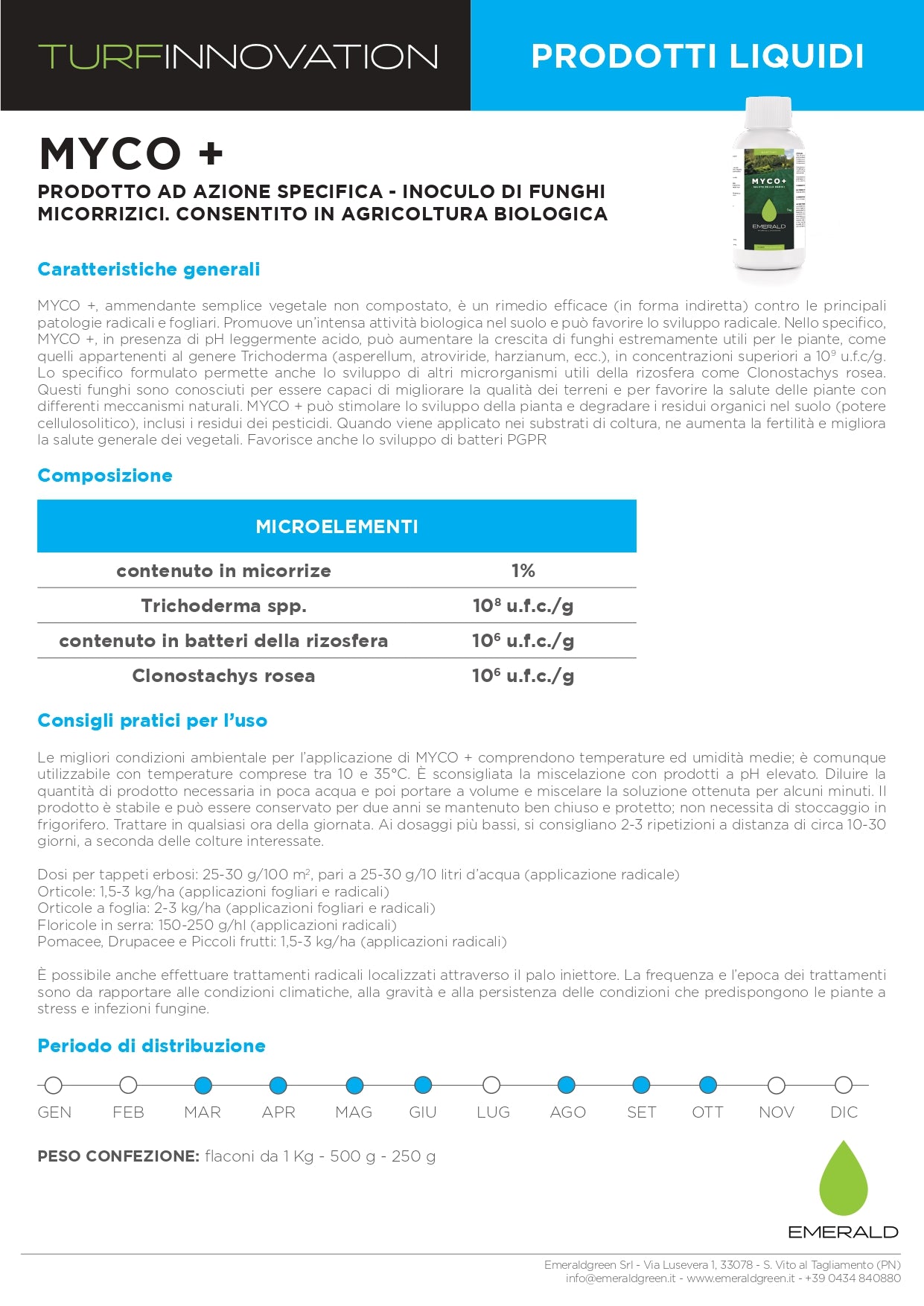 Questi funghi sono conosciuti per essere capaci di migliorare la qualità dei terreni e per favorire la salute delle piante con differenti meccanismi naturali. MYCO + può stimolare lo sviluppo della pianta e degradare i residui organici nel suolo (potere cellulosolitico), inclusi i residui dei pesticidi. Quando viene applicato nei substrati di coltura, ne aumenta la fertilità e migliora la salute generale dei vegetali. Favorisce anche lo sviluppo di batteri PGPR.