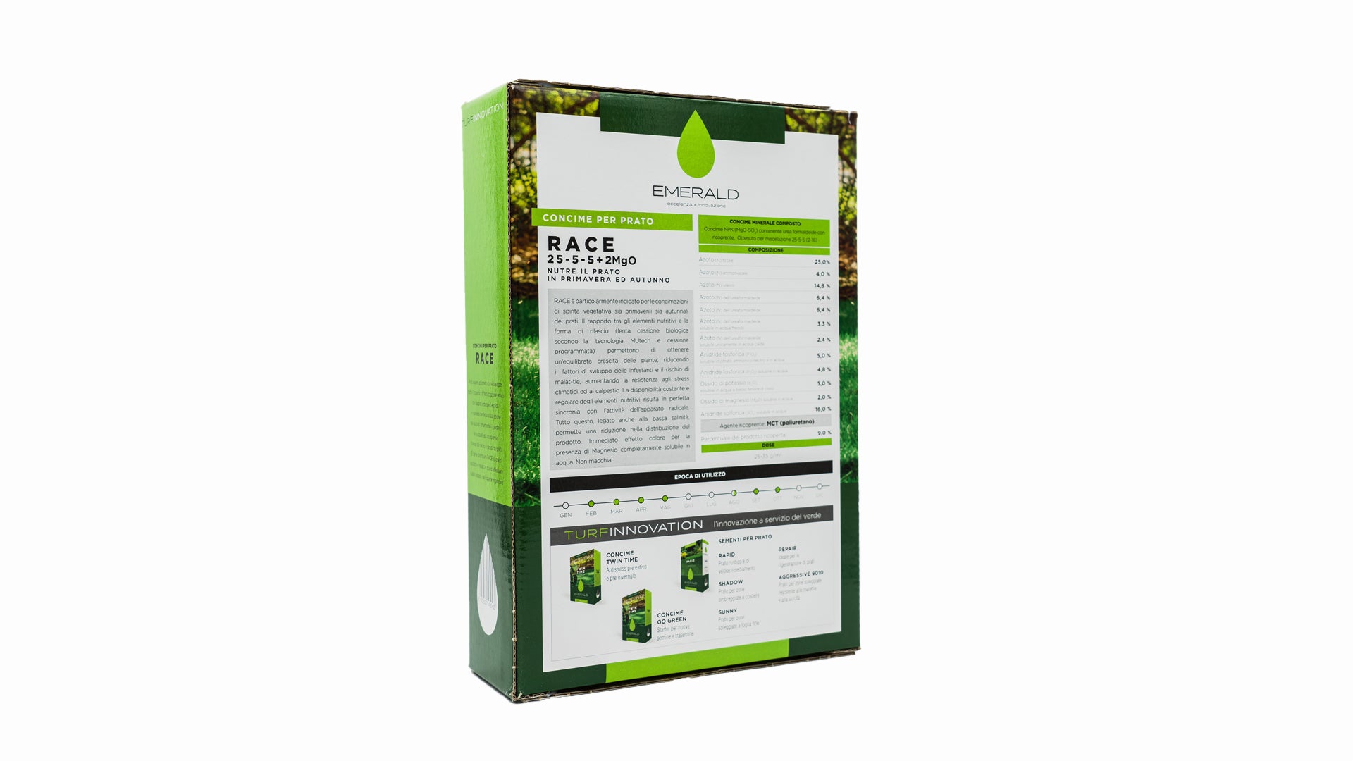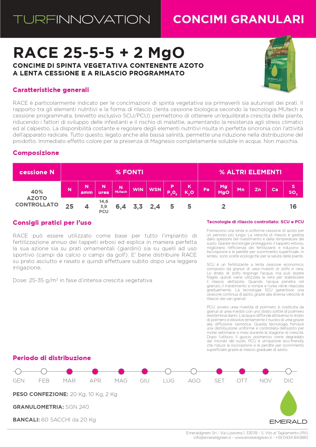RACE è particolarmente indicato per le concimazioni di spinta vegetativa sia primaverili sia autunnali dei prati. Il rapporto tra gli elementi nutritivi e la forma di rilascio (lenta cessione biologica secondo la tecnologia MUtech e cessione programmata, brevetto esclusivo SCU/PCU) permettono di ottenere un’equilibrata crescita delle piante, riducendo i fattori di sviluppo delle infestanti e il rischio di malattie, aumentando la resistenza agli stress climatici ed al calpestio. La disponibilità costante e regolare degli elementi nutritivi risulta in perfetta sincronia con l’attività dell’apparato radicale. Tutto questo, legato anche alla bassa salinità, permette una riduzione nella distribuzione del prodotto. Immediato effetto colore per la presenza di Magnesio completamente solubile in acqua. Non macchia.