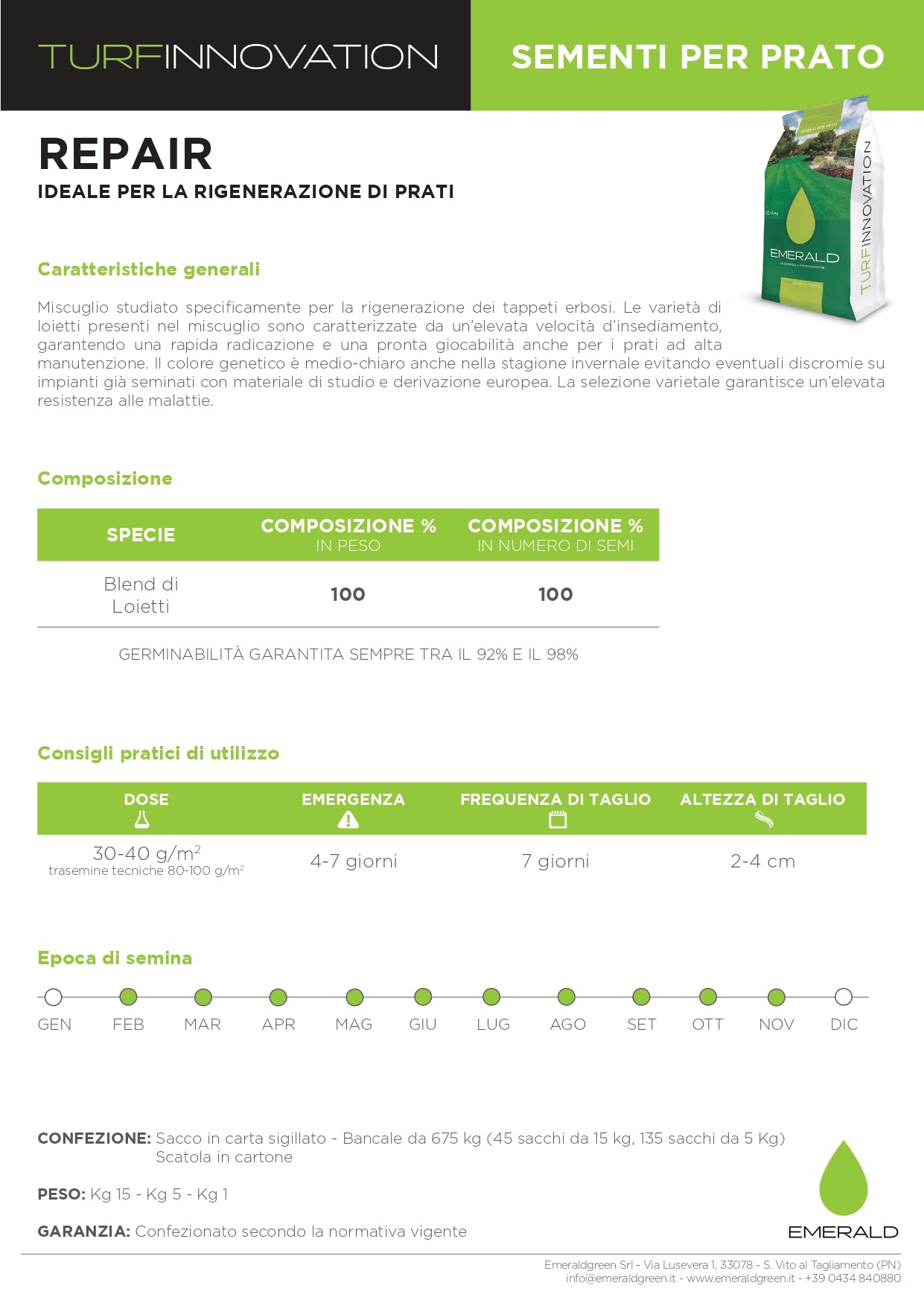 Miscuglio studiato specificamente per la rigenerazione dei tappeti erbosi. Le varietà di loietti presenti nel miscuglio sono caratterizzate da un’elevata velocità d’insediamento, garantendo una rapida radicazione e una pronta giocabilità anche per i prati ad alta manutenzione. Il colore genetico è medio-chiaro anche nella stagione invernale evitando eventuali discromie su impianti già