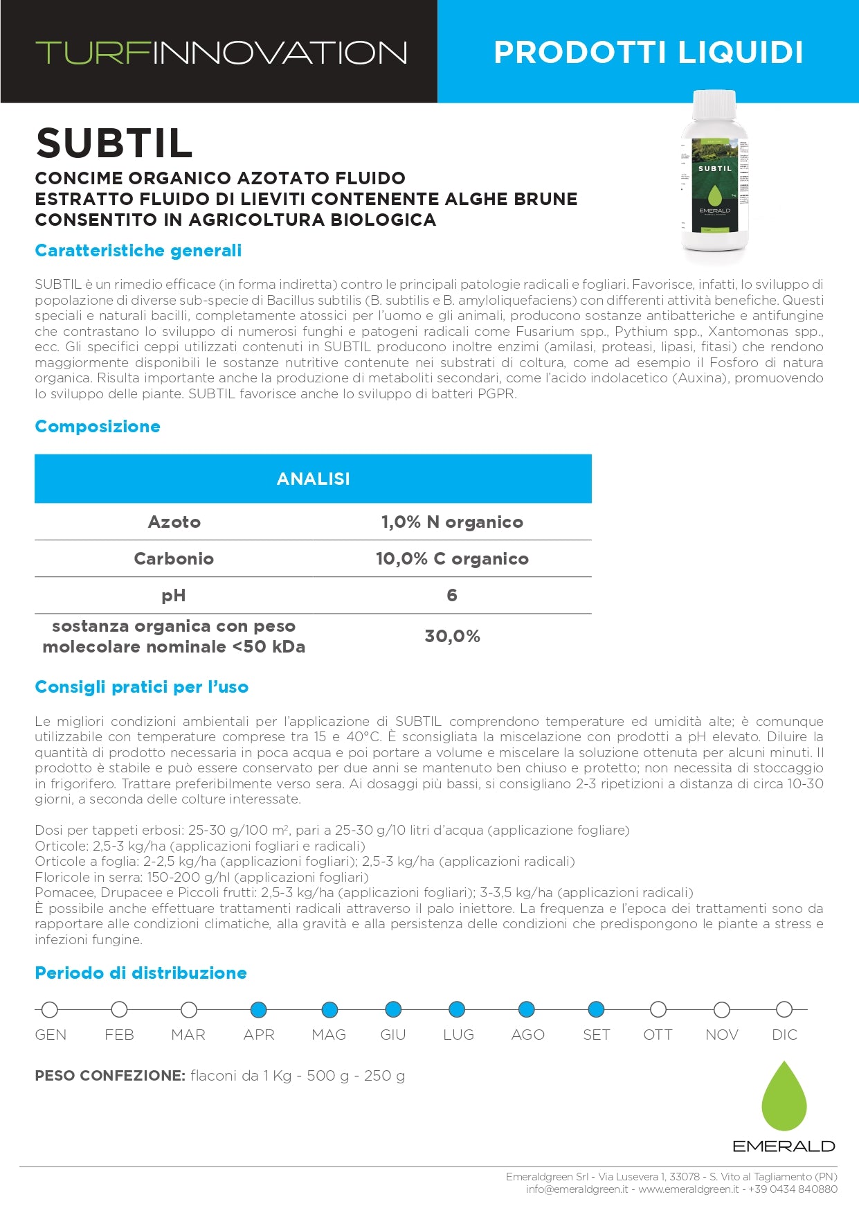 SUBTIL è un rimedio efficace (in forma indiretta) contro le principali patologie radicali e fogliari. Favorisce, infatti, lo sviluppo di popolazione di diverse sub-specie di Bacillus subtilis (B. subtilis e B. amyloliquefaciens) con differenti attività benefiche. Questi speciali e naturali bacilli, completamente atossici per l’uomo e gli animali, producono sostanze antibatteriche e antifungine che contrastano lo sviluppo di numerosi funghi e patogeni radicali come Fusarium spp., Pythium spp., Xantomonas spp., ecc. Gli specifici ceppi utilizzati contenuti in SUBTIL producono inoltre enzimi (amilasi, proteasi, lipasi, fitasi) che rendono maggiormente disponibili le sostanze nutritive contenute nei substrati di coltura, come ad esempio il Fosforo di natura organica. Risulta importante anche la produzione di metaboliti secondari, come l’acido indolacetico (Auxina), promuovendo lo sviluppo delle piante. SUBTIL favorisce anche lo sviluppo di batteri PGPR.