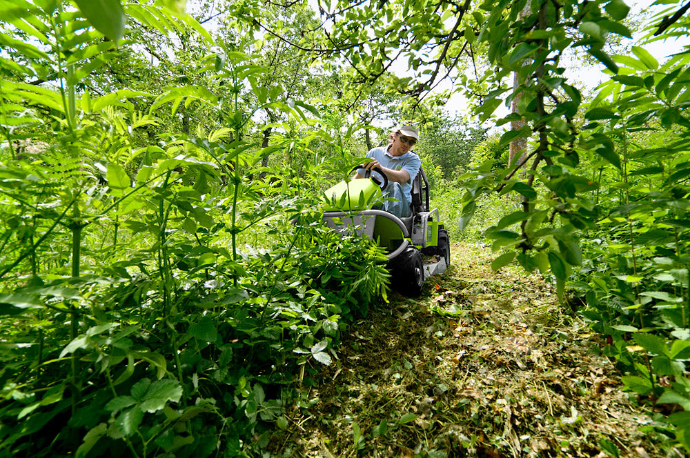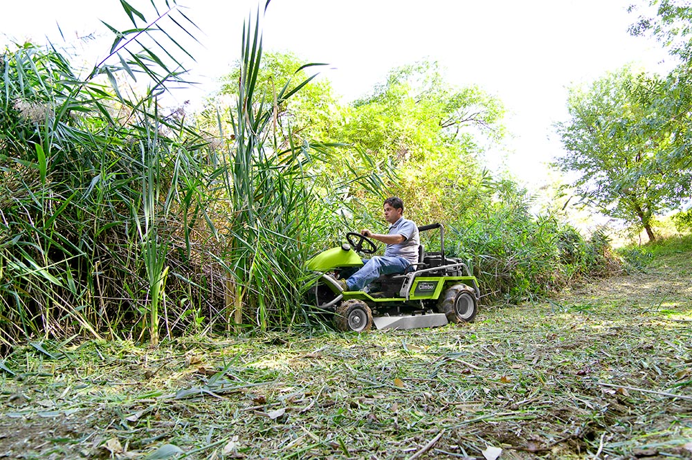 Trinciaerba idrostatico a lama dotato di bloccaggio differenziale e freni di sicurezza anteriori, è ideale per il taglio di erbe alte e arbusti legnosi in condizioni di pendenza e terreni irregolari.