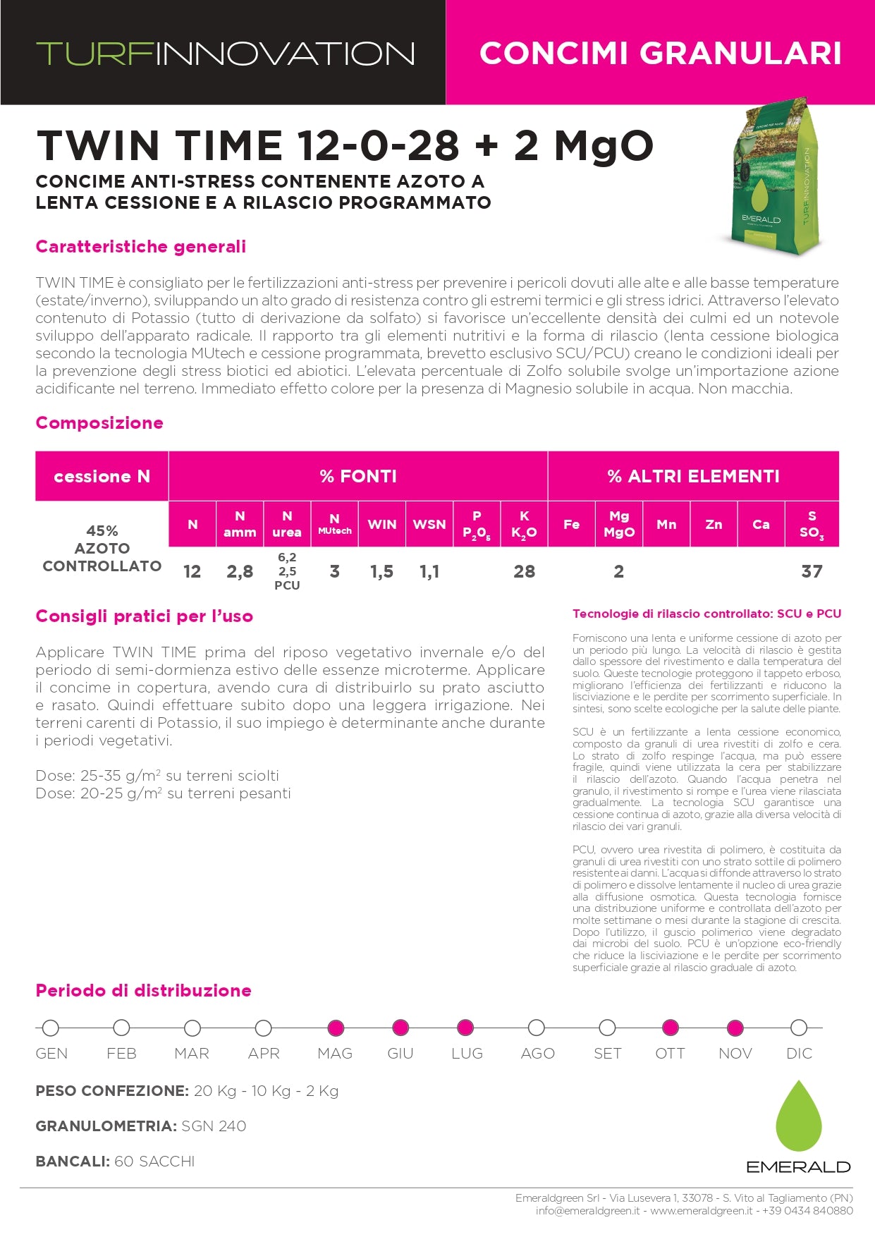 TWIN TIME è consigliato per le fertilizzazioni anti-stress per prevenire i pericoli dovuti alle alte e alle basse temperature (estate/inverno), sviluppando un alto grado di resistenza contro gli estremi termici e gli stress idrici. Attraverso l’elevato contenuto di Potassio (tutto di derivazione da solfato) si favorisce un’eccellente densità dei culmi ed un notevole sviluppo dell’apparato radicale. Il rapporto tra gli elementi nutritivi e la forma di rilascio (lenta cessione biologica secondo la tecnologia MUtech e cessione programmata, brevetto esclusivo SCU/PCU) creano le condizioni ideali per la prevenzione degli stress biotici ed abiotici. L’elevata percentuale di Zolfo solubile svolge un’importazione azione acidificante nel terreno.